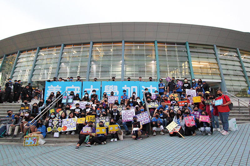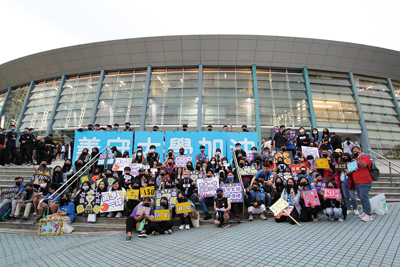2021義大男籃UBA台北小巨蛋決賽,校長與加油團賽前於入口處大合照。