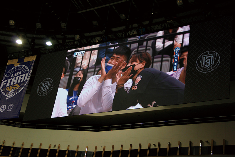 2021義大男籃UBA台北小巨蛋決賽,中場休息請球迷跟著球員動作做,攝影鏡頭帶到邱子軒(左)小娟教練(右)。