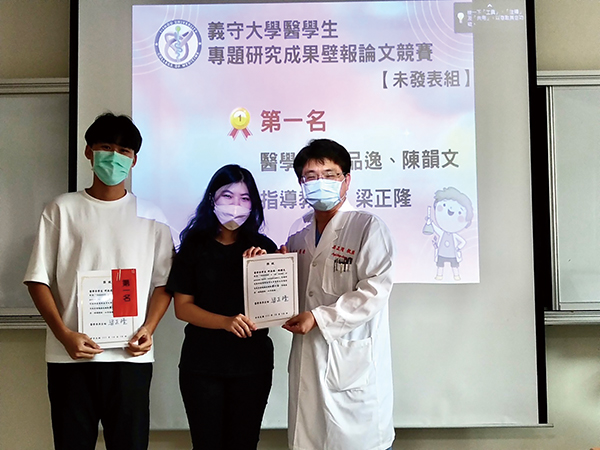 義守大學醫學系四年級學生何品逸(左)與陳韻文(中),以義大醫院新進的「加馬刀系統(Leksell Gamma Knife ICON)」主題,榮獲研究組第一名