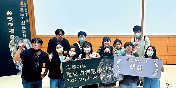 義守大學創設系歐晴華(前排右二),以百變包包作品「無限」,獲得「2022年第21屆壓克力創意設計競賽」銀獎與10萬元的獎金