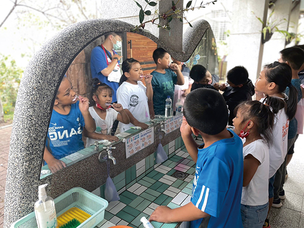健管系學生利用午餐時間,教導學童正確刷牙的方式,小學生認真學習、立即驗收